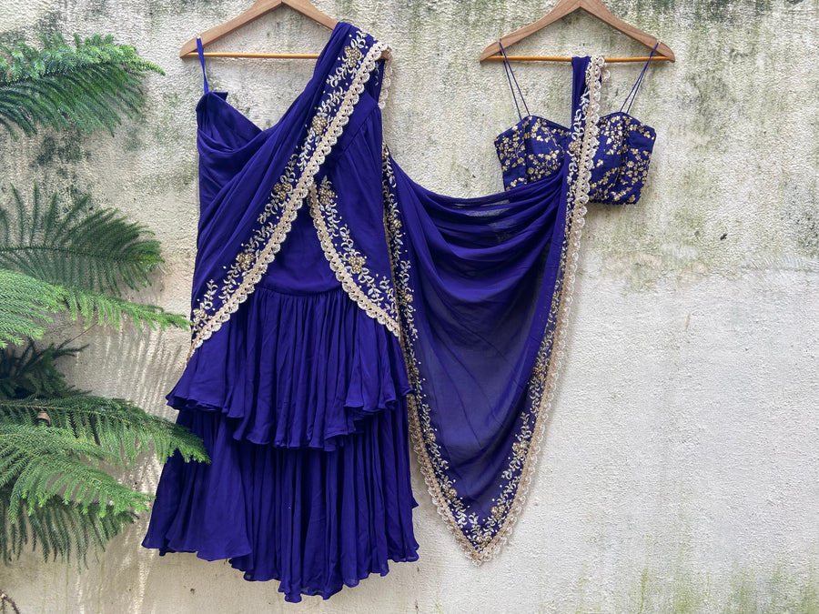 Indigo Blue georgette pre-stitched ruffled saree with pearl and zardozi rose gold hand embroidery and scalloped edging paired with zari work bustier.
